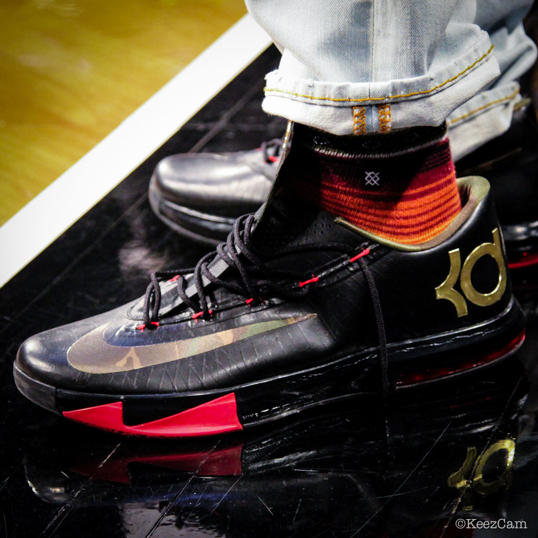 Kevin Durant总说自己不是sneakerhead,但这不保证他的身边人也不是。上周雷霆对阵网队的赛场边,KD的哥哥Tony亲着曝光了一款全新配色的KD 6。黑色鞋身配以金色KD logo以及红色鞋眼/大底,swoosh以及内衬均附有迷彩纹里装饰。