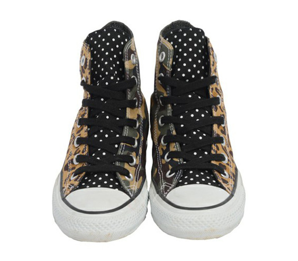 X-Girl 是日本知名潮流品牌 X-Large 专为女性市场打造的支线,此番携手 Converse 带来了 Chuck Taylor All-Star Hi “Crazy” 联名鞋款。鞋面将潮味十足的迷彩和豹纹图案以不对称的方式处理,鞋舌上更是融入了在日本非常流行的水玉波点,使整体的潮流韵味更加强烈。