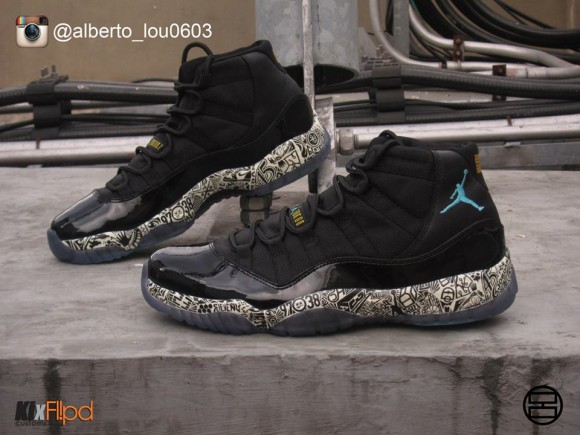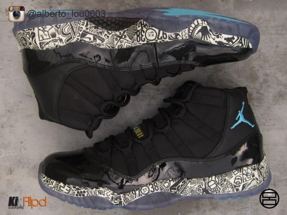 眼前这双出自Alberto Lou之手的定制版“夜光镭射”Air Jordan XI选用全新伽马蓝版本做为模板,保留鞋身配色,黑色中底涂以帆白色夜光染料并绘上Air Jordan镭射纹理,黑夜中效果不俗。