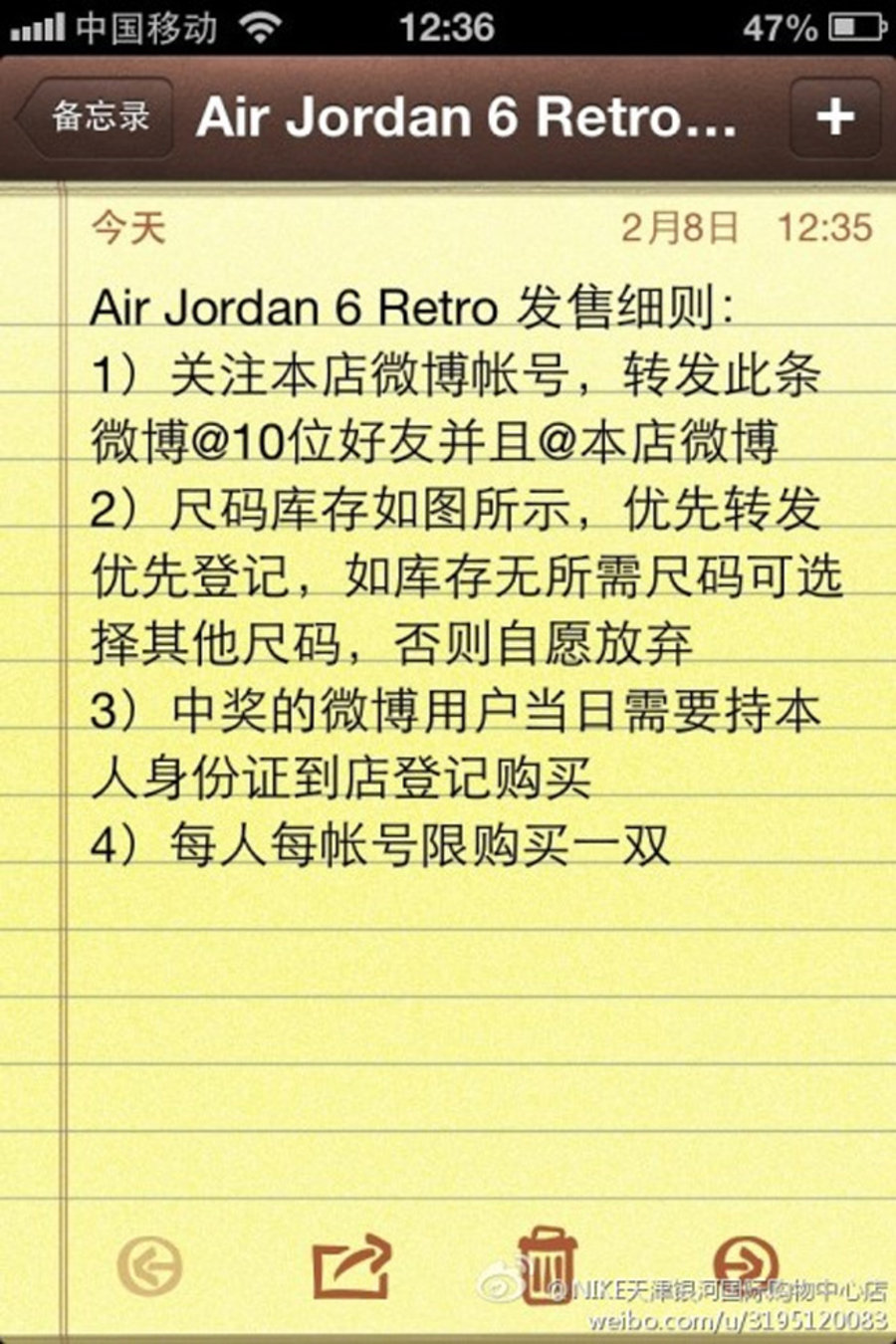 NIKE天津银河国际购物中心店:银河NIKE将于2月14日限量发售Air Jordan 6 Retro GS。本次发售将采取微博优先登记购买的方式(尺码36-38半,售价:¥839)发售细则具体入最下方图片所示。