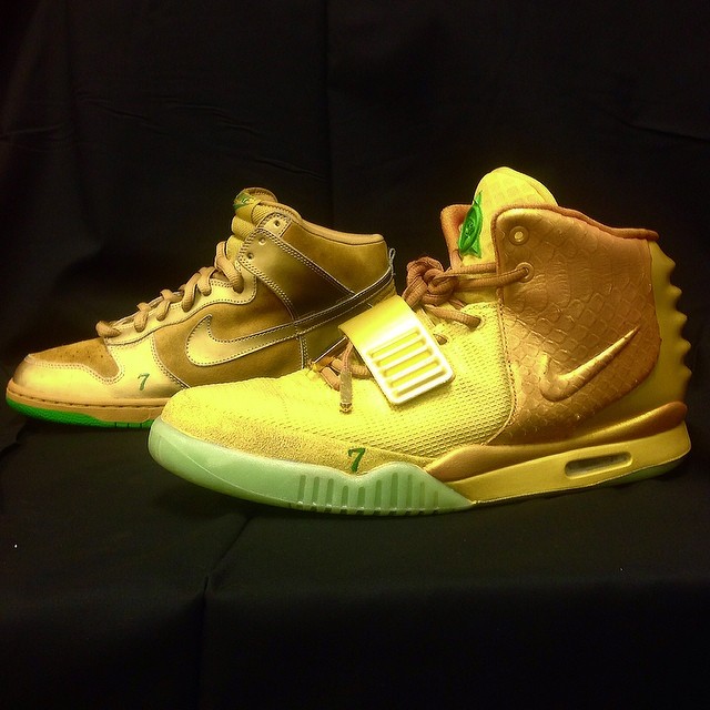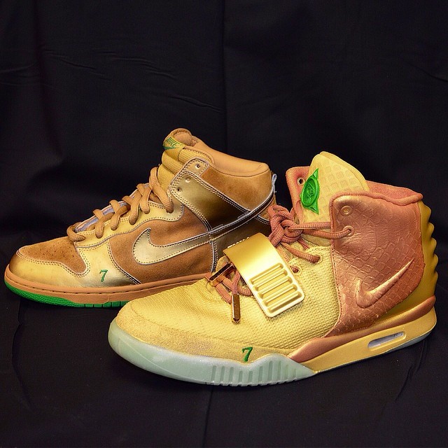 kickassokustomsneakers近日将Nike Dunk High Pro SB “Lucky 7的经典元素运用在Nike Air Yeezy 2之上,打造出一双极具特色的定制鞋款。金色鞋身搭配夜光大底,辅以鞋头的绿色“7”字样及绿色鞋舌Logo,令鞋款呈现出别样的魅力。