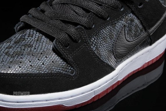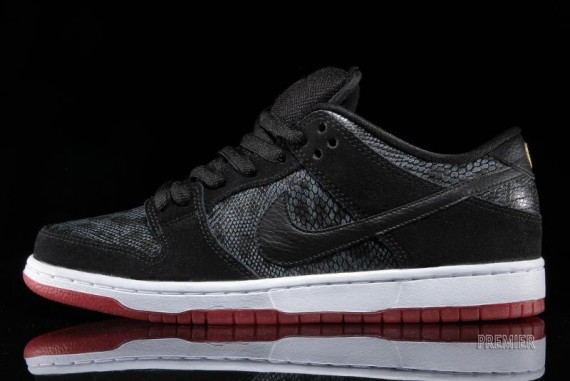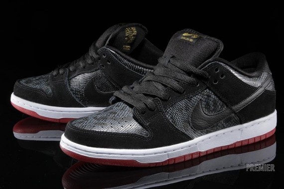 低调的黑灰蛇皮鞋身辅以黑色麂皮细节,并搭配白红细节及金色点缀令这双Nike SB Dunk Low “Snake Eyes”显得极为别致。据悉这双Nike SB Dunk Low “Snake Eyes”将于近日正式上市,售价:98美元,货号: 313170-017。