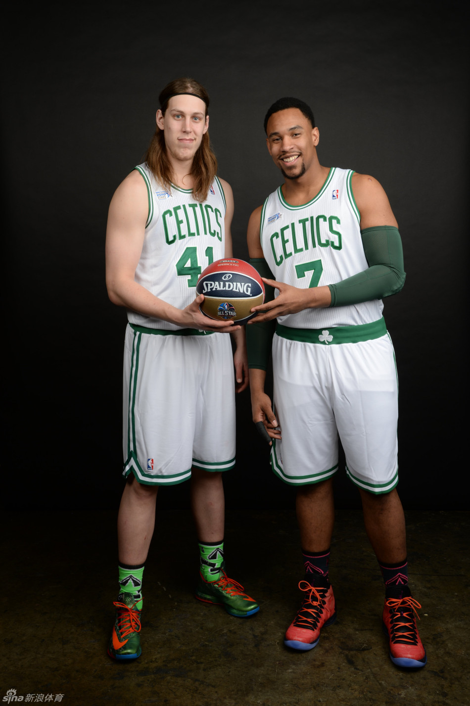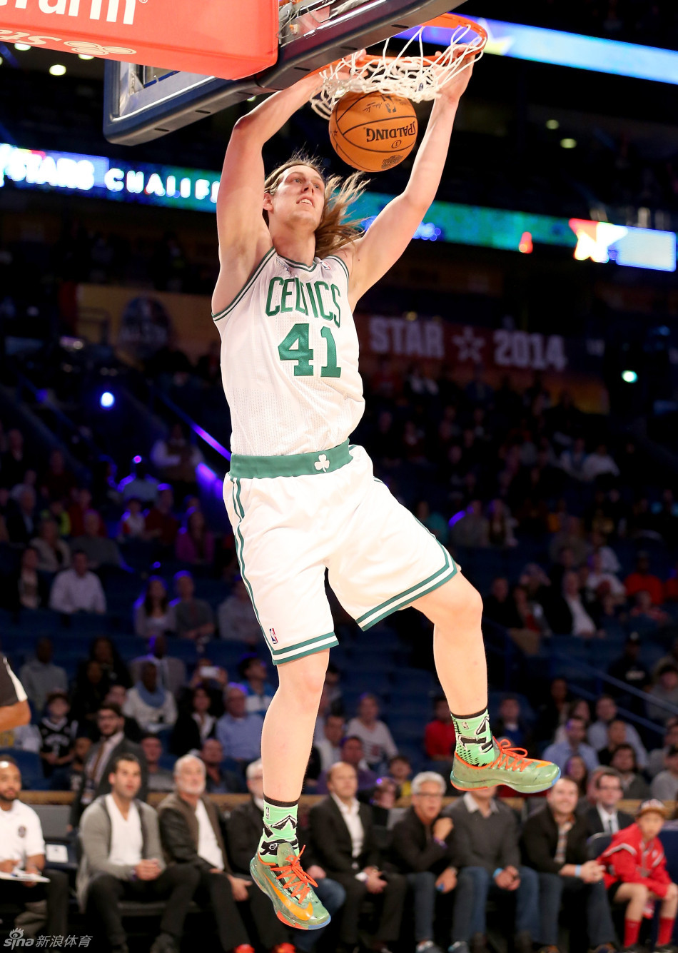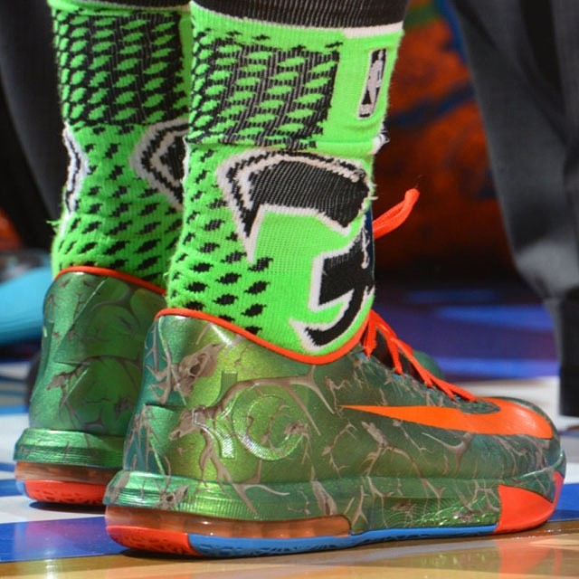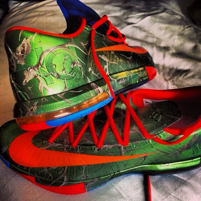 在今天上午结束的2014新秀赛上,凯尔特人队新秀凯利-奥利尼克穿着了一双非常特别的Nike KD VI“Big Game Hunter”定制鞋款。绿色鞋身呈现出独特的金属光泽,辅以橙色细节及蓝色大底,令球鞋呈现出极为别致的感觉。(图片来源网络)