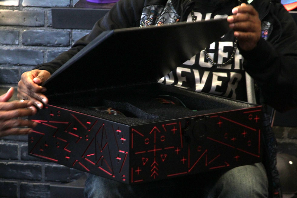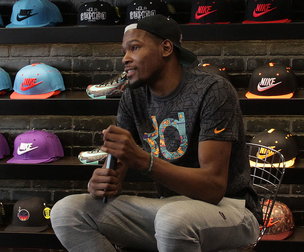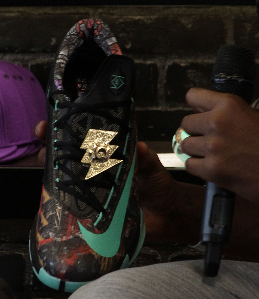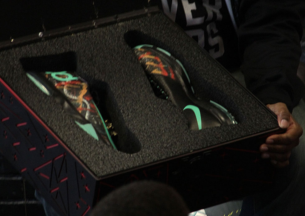 Kevin Durant现身新奥尔良House of Hoops店铺,在与大家谈论全明星赛以及新球鞋的同时,收到了一双为其特别打造的专属 Nike KD6,这双18码的PE除了附有特别鞋盒之外,更是附上金属金色的鞋带装饰扣。