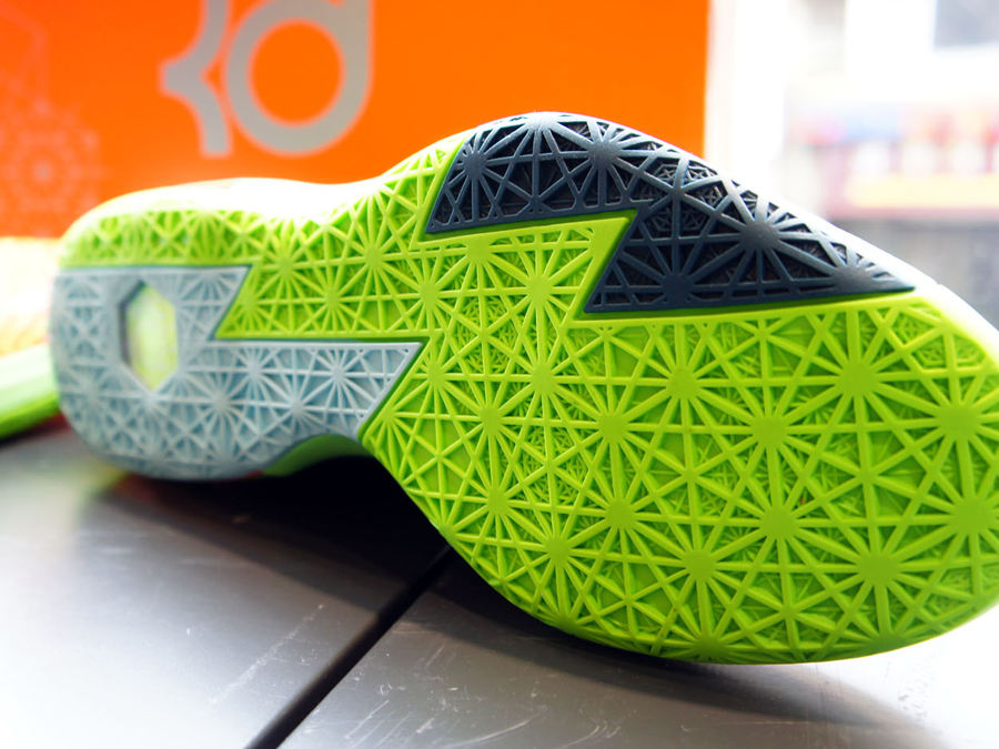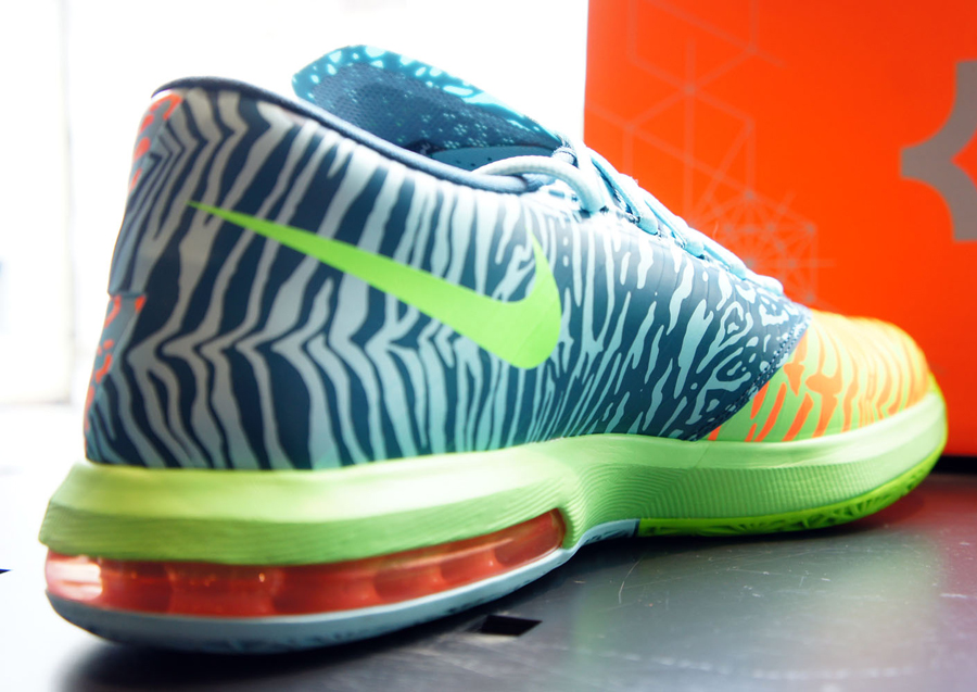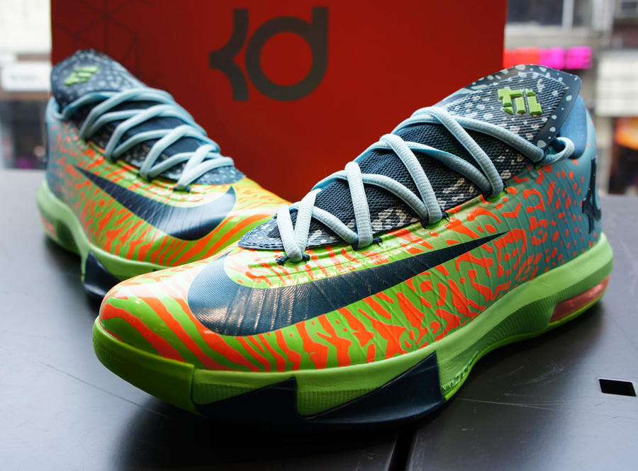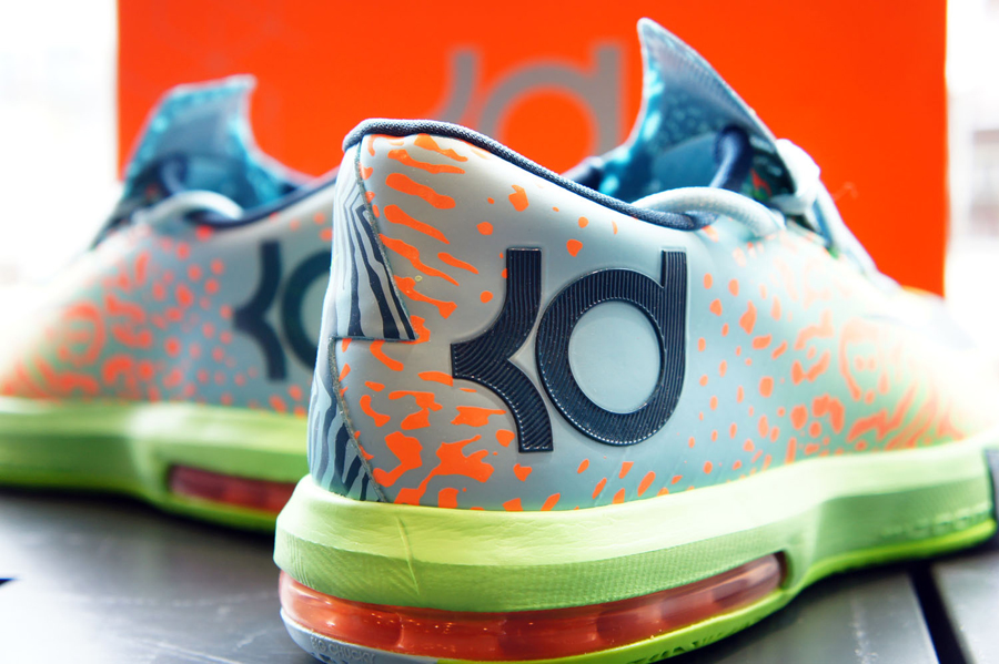 杜兰特昨天在投篮之星比赛中穿着的这双Nike KD 6 “Liger”将于3月1日正式上市,绿色渐变鞋身辅以灰蓝色细节,鞋面上覆盖有特别的虎纹迷彩装饰,令鞋款呈现出别致的感觉。此鞋款货号:599424-302,售价:130美元。