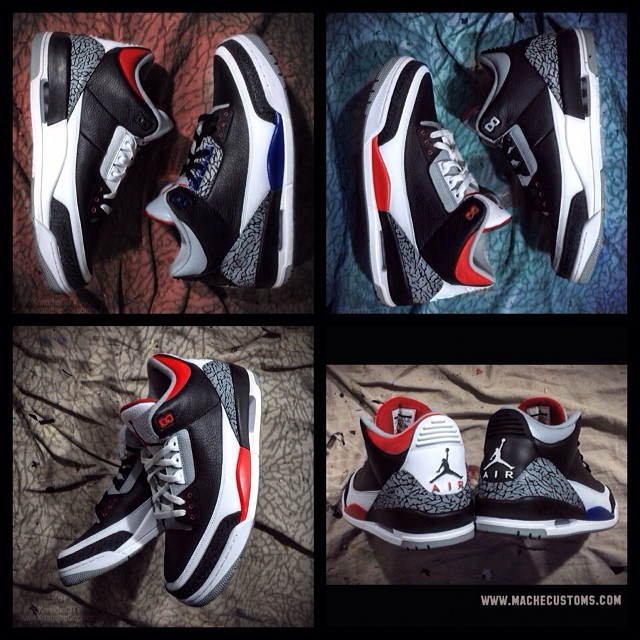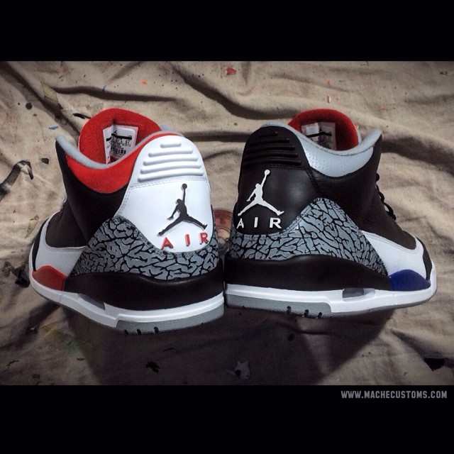 为庆祝乔丹的51岁生日,美国著名球鞋定制师Mache特意打造了一双Air Jordan 3“What The Air Jordan 3”定制鞋款。此鞋用左右脚不同的鸳鸯设计,将“Fire Red”、”True Blue“、”Black Cement“、“Cement”四款元年配色的经典元素运用在鞋身细节上,呈现出极为别致的效果。