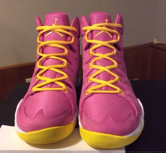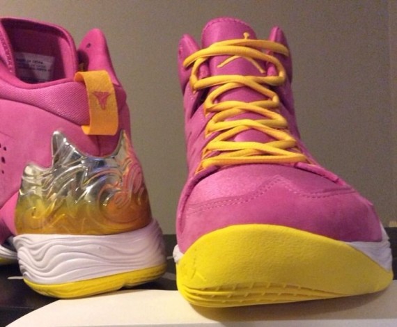 Jordan Brand为防患乳癌意识月打造了四款Jordan Melo M10,每一双都与一所大学球队相关。眼前这双带有金黄色细节的配色便是为马奎特大学制作的PE,粉色为主配以黄色细节并在后跟以金银色渐变装饰。此款PE现正在ebay出售中。