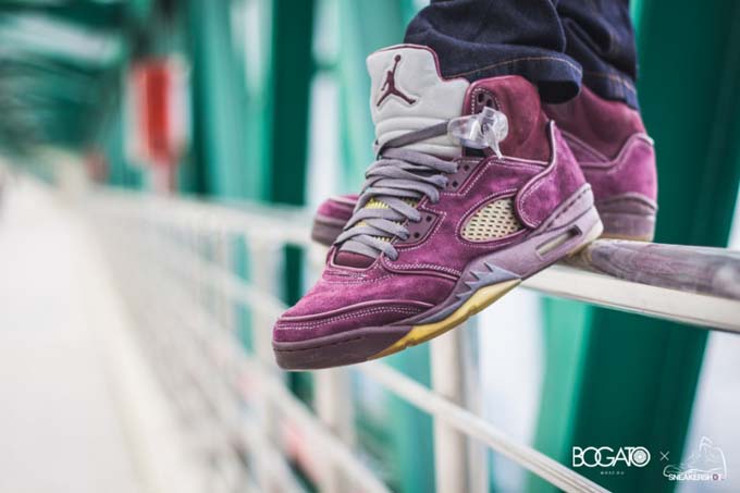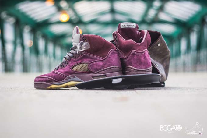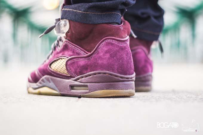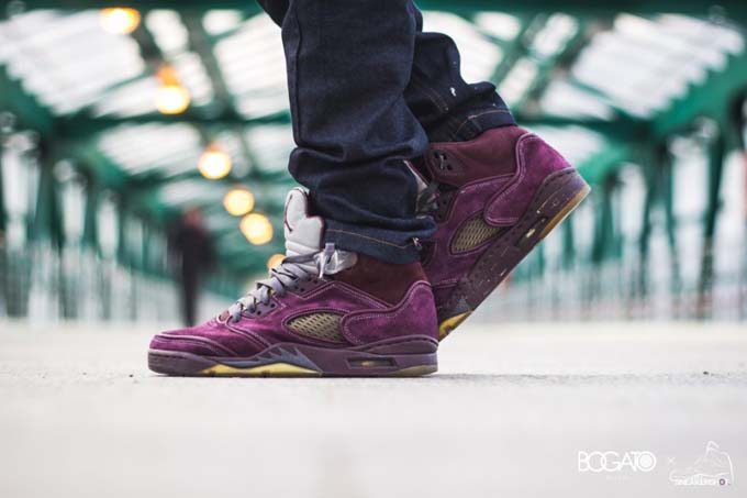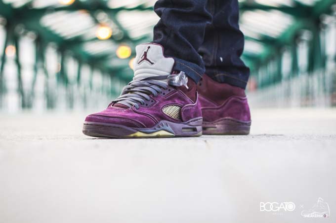 这双 Air Jordan 5 是不是十分眼熟?没错,这双出自球鞋定制爱好者 Maggi 之手的 Air Jordan 5 “Violet” 定制作品与官方曾推出的 “Burgundy” 配色十分神似,Maggi 此次运用了意大利高级麂皮搭配皮革面料打造鞋身,质感上乘,而泛黄的水晶大底更是为这款定制作品增添了一丝特别的韵味。