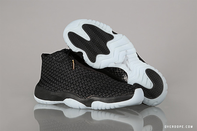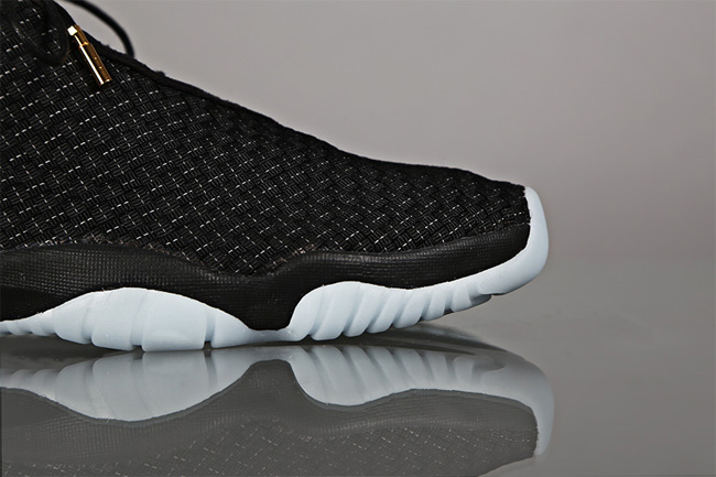 鞋身上的编织面缎来自于 Air Jordan 15 之上, 且上头衬有的3M反光面饰更是带给鞋迷们绝妙惊喜感, 鞋带头端的金属结具源自于 Air Jordan 14, 其所搭载的 Air Jordan 11 经典外底更是让人喜爱万分, 其中一款以经典的黑色中底衬上半透明红色外底所设计, 另款则以黑色中底置上夜光透明外底, 皆各自带出不同的设计风味. 眼尖的鞋迷们肯定可以发现在 Jordan Future 上的设计特色皆是源自于 Tinker Hatfiled 的 Air Jordan 经典设计元素, 身为 Jordan 迷的您岂能错过.