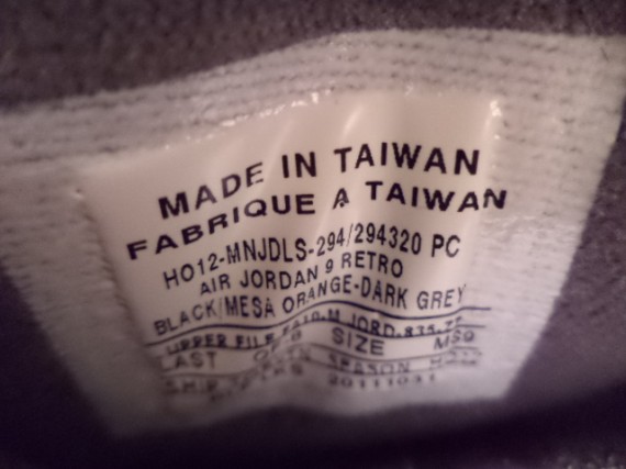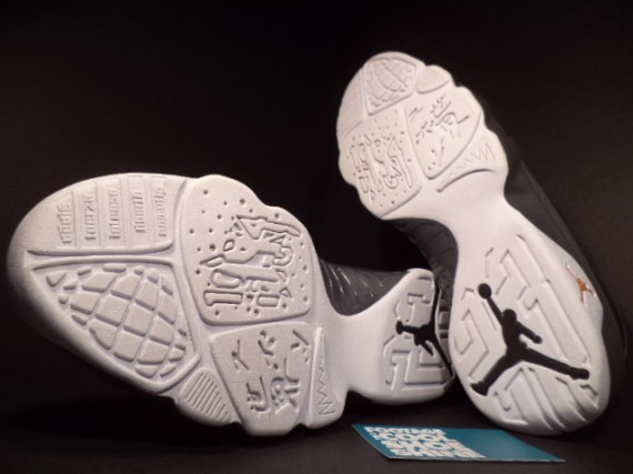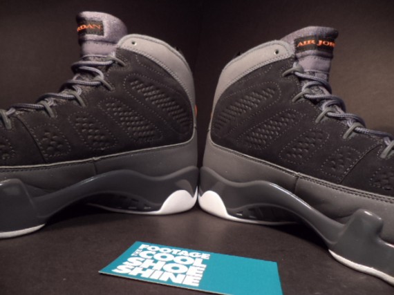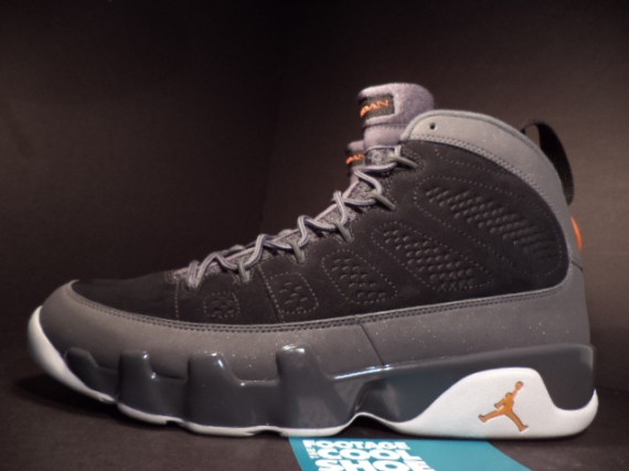 今年会有多少Air Jordan 9推出无法确认,但可以肯定的是即将推出的男爵队别注配色。不过网上曝光了一款原定于2012年冬季上市却未能实现的Air Jordan 9样品,鞋身选用黑色麂皮搭配灰色人造革,细节点缀梅萨橙,再配以灰色鞋舌/中底以及白色大底。