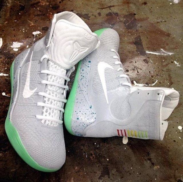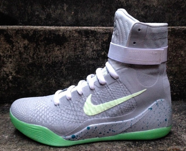 同样是高帮设计,同样呈现球袜感,同样颇具未来气质,Nike Kobe 9 Elite以及Nike Air Mag被clean13kicks巧妙结合在了一起。在保留全明星配色Kobe 9 Elite的夜光大底的基础上,clean13kicks将鞋身染成统一的灰色调,swoosh覆盖夜光材质,中底加上水蓝色泼墨细节,Mag的LED灯则呈现在后跟九条伤口疤痕刺绣的位置。