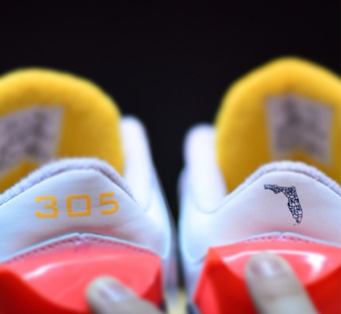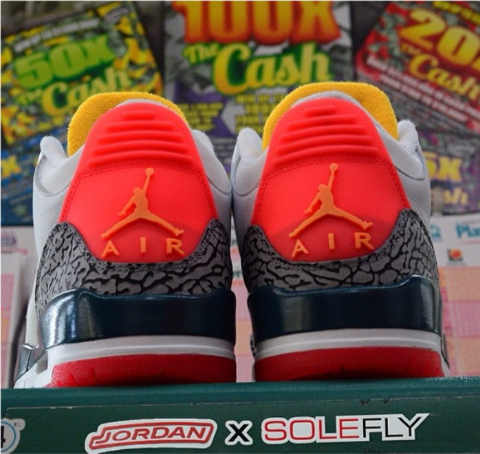 迈阿密鞋店Solefly再度发布Sloefly x Air Jordan 3 细节谍照:左右脚白色后跟上分别印有迈阿密地区区号305与佛罗里达州地图细节,并搭配橙红色TPU装饰。据悉这双Solefly x Air Jordan 3将在Solefly以抽签方式极限量的方式发售25双。