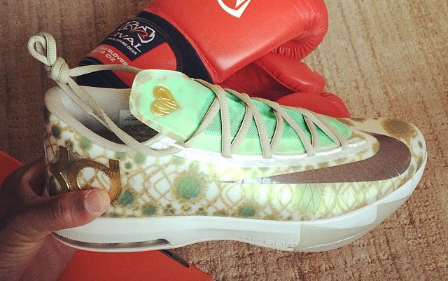 继Nike KD 4上首次呈现后,KD 6再度打造别注版本向Kevin Durant的母亲Wanda Pratt致敬。淡色调鞋身印有翡翠饰品图案装饰,细节点缀金色并在鞋舌附上Wanda Pratt的心形logo。此款Nike KD 6暂时没有市售计划。