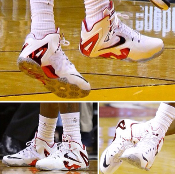 对阵布鲁克林的比赛中,LeBron James亲穿曝光了又一款新球鞋,一双全新热火主场配色的Nike LeBron 11 Elite PE。白色作为鞋身主色调,红色细节以及极富金属质感的Hyperposite装饰于身,再配上灰色大底。