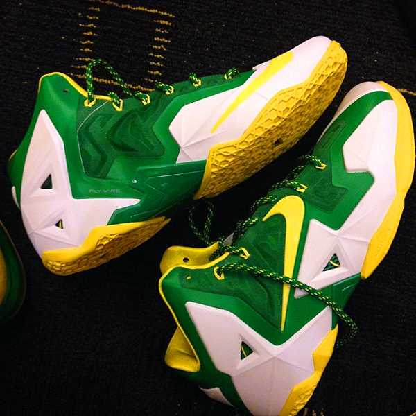 鸭队后卫Joseph Young在网上晒出了自己的新球鞋,LeBron 11 PE。Nike因NCAA疯狂三月的赛程而特别打造,Joseph Young自然也将在此期间着用这款以绿色为主色搭配白色以及黄色细节的校队PE亮相赛场。