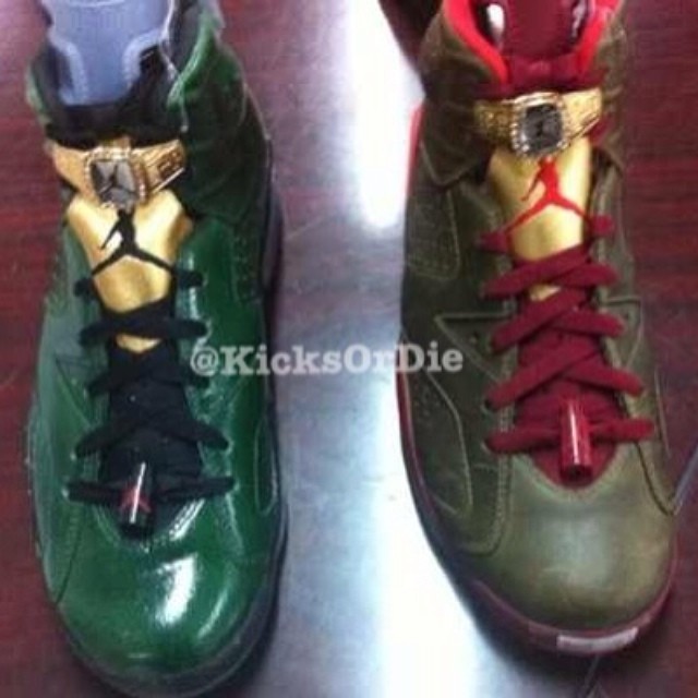 眼前这两双全新配色的Air Jordan 6,一双为我们曾介绍过多次的“冠军雪茄”配色,据悉该配色是为纪念乔丹当年穿着Air Jordan 6 拿下人生首个NBA冠军而特别打造的,深棕色皮质鞋面令鞋款呈现出雪茄的感觉,并配以金色及红色细节。Air Jordan 6“冠军雪茄”配色货号:384664-250。而另外一款则以绿色漆皮呈现鞋身,搭配金色鞋舌与黑色内衬,并辅以金色冠军戒指细节。此鞋款标志性的绿/黄/黑色调让人不免联想到此鞋是为了纪念当年打赢超音速赢得总冠军而推出的超音速配色。