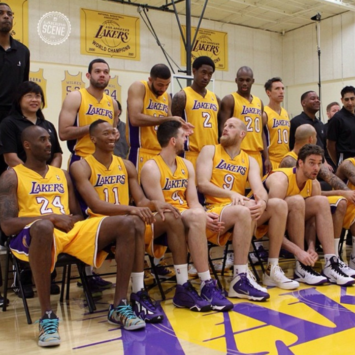 Kobe Bryant 近日在参与洛杉矶湖人队“全家福”的拍摄时,上脚了一双全新的Nike Kobe 球鞋——Nike Kobe 9 Low EM。此鞋款使用EM工程网面打造而成,鞋面选用黑、棕、绿条纹呈现,辅以白色大底及蓝色中底。薄荷绿鞋带及白灰科比剑鞘Logo点缀鞋身之上。虽然Nike Kobe 9 Low EM尚未曝光具体发售信息,但相信随着越来越多的曝光此鞋的发售应该不远了。