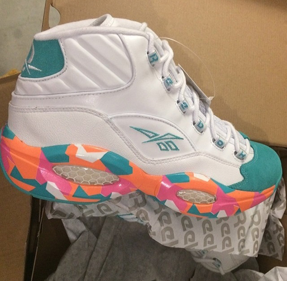 这款全新配色的Reebok Qustion 以白色为主色调,搭配清新的薄荷绿麂皮鞋头及细节点缀。中底选用橙、粉、薄荷绿多色调的迷彩图案涂装而成,清新而富有特点。据悉这双Reebok Qustion 1预计将在5月23日发售,售价:V44034。