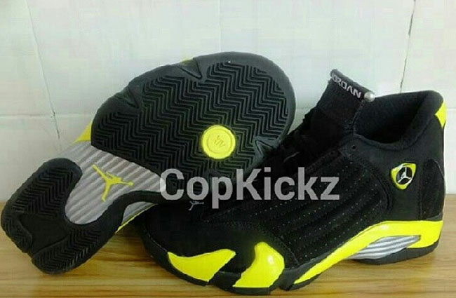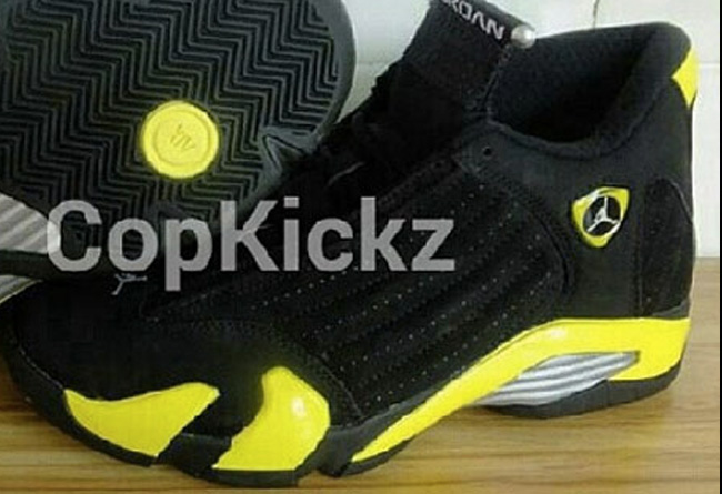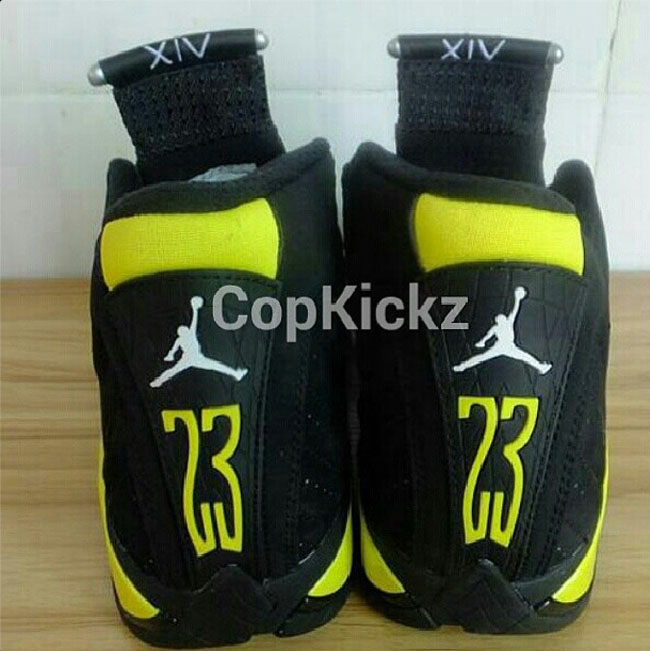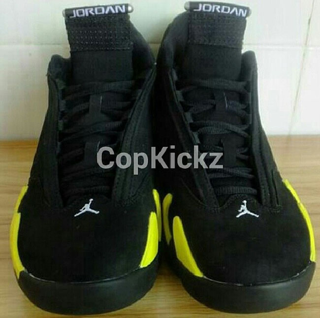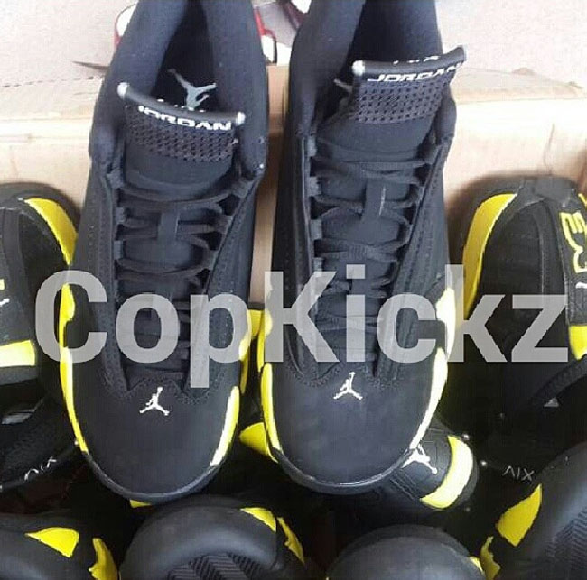 雷公配色的 Air Jordan 14 "Thunder" 现在有了更为详细的实物图片。整体鞋身采用黑色牛巴革打造,黄色的细节起到了颇为抢眼的点缀作用,将于 7 月 4 日正式发售。 货号:487471-070 发售日期:7 月 4 日