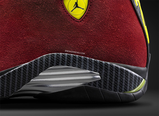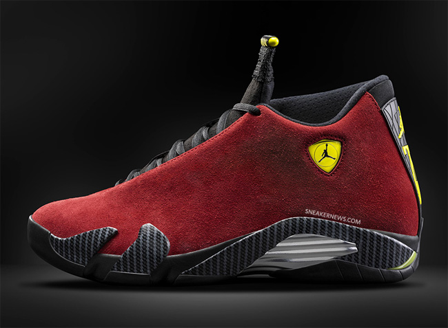 以法拉利跑车为设计灵感的 Air Jordan 14 在今年有多款配色发售,而这款红色麂皮配色则颇为惊艳。