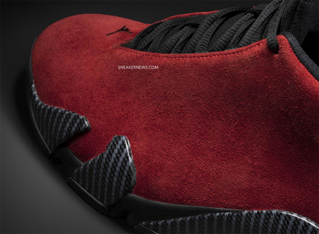 鞋身采用质感十足的红色麂皮材质打造,而中底和经典剑齿造型则采用碳纤维纹路覆盖,现代科技感十分强烈。细节则辅以黑色,金黄的点缀也颇为抢眼。无疑是 Air Jordan 14 系列里比较抢眼的配色。