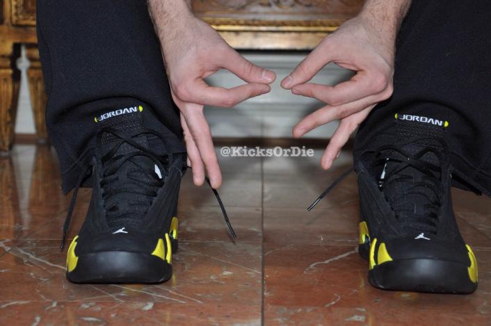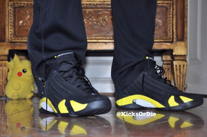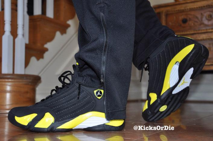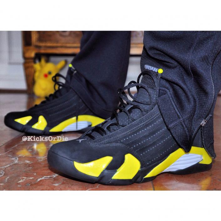 全新雷公配色Air Jordan 14 "Thunder" 将于 7 月 4 日正式发售,在此之前实物照已有数次曝光,近日再释出实鞋上脚效果照。黑色牛巴革鞋身搭配明黄色细节点缀,低调中颇有雷鸣驰骋感。 货号:487471-070 发售日期:7 月 4 日