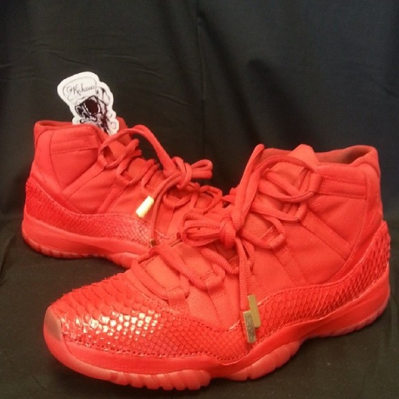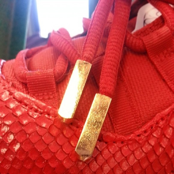 有时候从球鞋定制者们的作品就能知晓一个配色主题是否受欢迎。Kickasso Kustoms选用“红色十月Yeezy 2”为灵感打造了一双“红色巨蟒”Air Jordan 11。鞋身红色网面织物搭配蛇鳞材质,鞋带换做与Yeezy 2相同的金色金属装饰,整体效果颇为出挑。