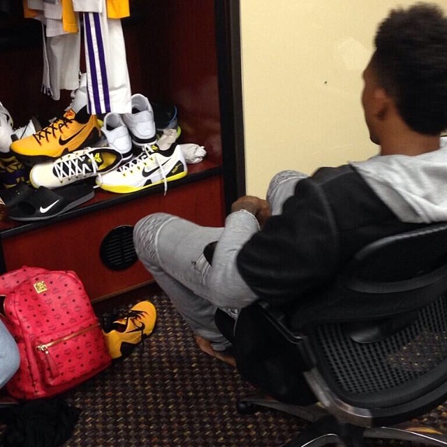 在今日主场对阵太阳的比赛中,Nick Young 上脚了一双全新“湖人”配色的 Nike Kobe 9 EM。白色工程网面鞋身搭配黄色大底及黑色内衬等细节点缀,令这双白黄黑色调的球鞋与湖人主场队服相得益彰。