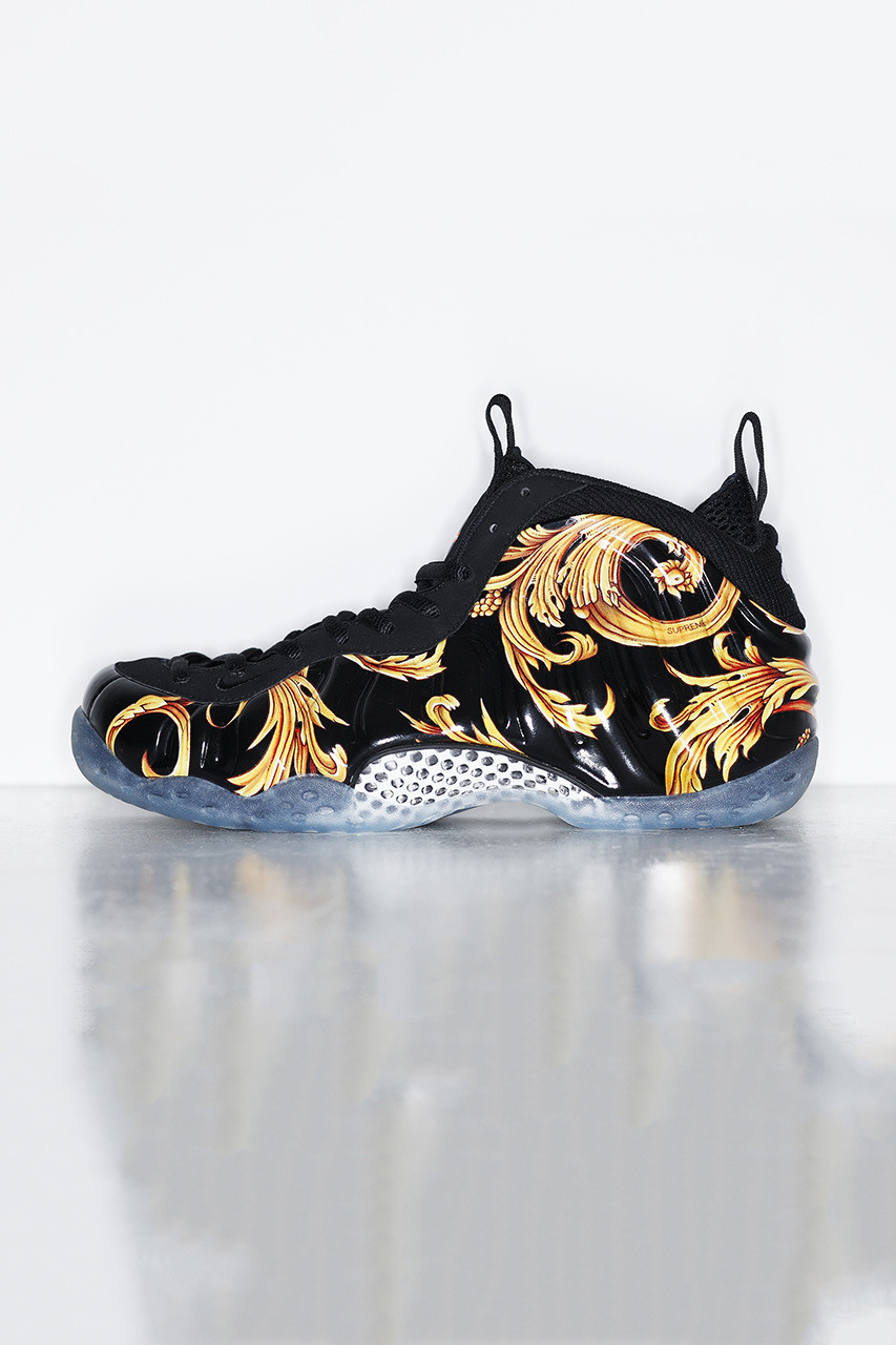 在继去年秋冬造成抢购的联名 Flyknit Lunar 1+ 后,于 2014 春夏季度,纽约传奇街牌 Supreme 再度携手运动品牌 Nike,展开全新一轮合作企划。今回双方选择了 1997 年问世的经典篮球鞋 Air Foamposite 1 作为蓝本,设计上分有红黑两种色调,并在签名式贝壳状鞋身融入金色图案营造奢华感与吸睛度,同时再搭配黑色鞋带以及半透明的外底呈现。