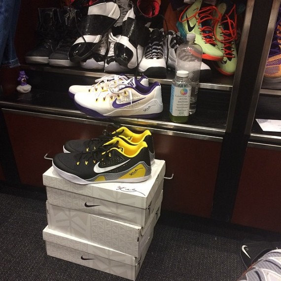 率先曝光“李小龙”配色,之后是附有图案装饰的“复活节”别注,现在由太阳队大前锋PJ Tucker为我们带来Kobe 9 EM真正应有的配色,湖人主客场。虽然这两双球鞋出现在太阳队的更衣室内,但白/紫/黄以及黑/黄两个色调依旧呈现着其紫金王朝的灵魂。暂时没有市售信息。