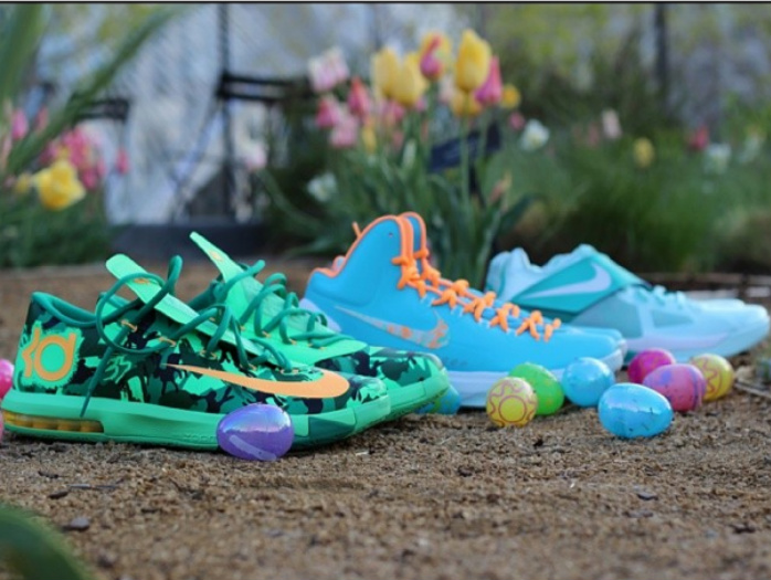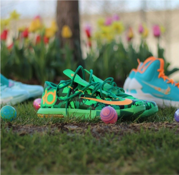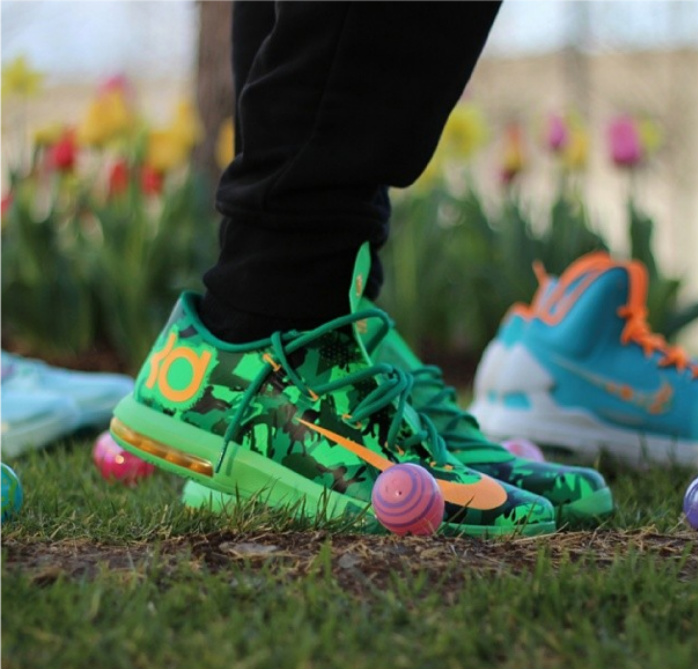 为迎接即将到来的复活节,Nike特意打造了一款Nike KD VI “Easter”。绿色鞋身上辅以独特的黑绿迷彩装饰,黄色KD Logo及Swoosh点缀鞋面之上,令鞋款极具视觉冲击,上脚效果不俗。据悉这款Nike KD VI “Easter”将于4月18日上市,货号:599424-303,售价:130美金。