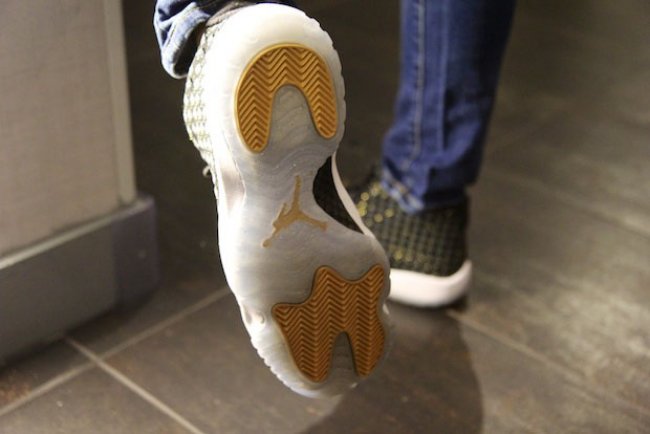 这款非市售的 Jordan Future “Jordan Brand Classic” PE 采用了黑色和金色相间的编制鞋面,反光效果使得黑金鞋面颇有亮点,再搭配白色中底和水晶大底形成一个视觉反差,整体上脚效果十分抢眼。