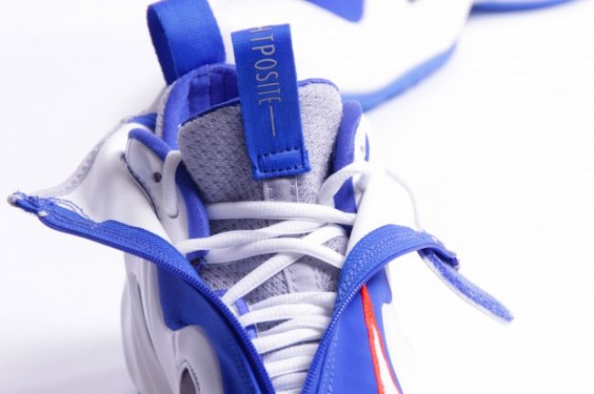 这次的复刻市售版参照了 99 年阿兰·休斯顿所穿着的 PE 款,白色的发泡鞋面搭配皇家蓝色的布料和大底,白色的 Swoosh 则采用了橙红色勾勒边缘,起到抢眼的点缀作用。
