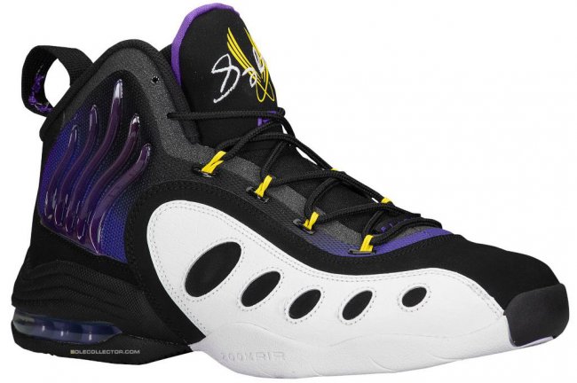 虽然2003年时的湖人“四大天王”未能捍卫天使城的荣耀,最终与总冠军失之交臂,但这仍是不少球迷的美好回忆,其中必定少不了Gary Payton的身影。为此,Nike特别打造湖人配色杂交鞋款Zoom Sonic Flight。鞋身选用黑色牛巴革搭配黑/毒液紫色渐变网面织物,再配上白色鞋侧以及黄色细节。此款货号641333-001,5月1日正式发售。