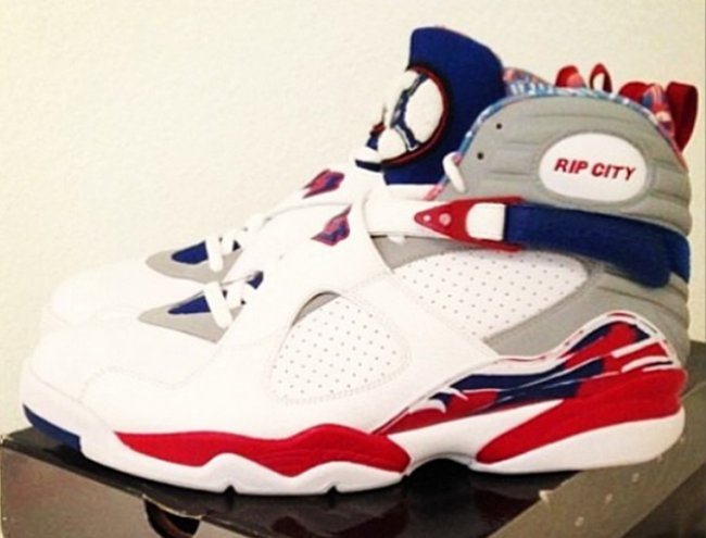 Rip Hamilton在底特律活塞效力了九年,2004年时获得总冠军戒指、2006至2008年三次入选全明星,另外,还能拥有不少红/白/蓝色调的个人专属Air Jordan球鞋。眼前这款Air Jordan 8是为其活塞时专门打造的主场配色PE,鞋身白色搭配灰色,辅以蓝色以及红色,鞋领附有RIP CITY字样的刺绣。