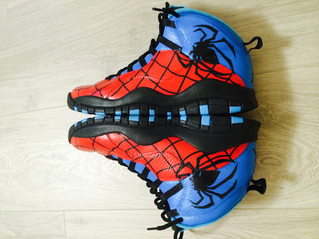 来源于网友 Stevenhkb 的投递,又一款他亲手打造的定制球鞋。 在 Air Jordan 10 "Powder Blue" 的鞋型基础上,运用了蜘蛛侠的蓝红配色,辅以黑色的细节,蜘蛛图案和蜘蛛侠经典的蛛网图纹则彰显了它的身份。