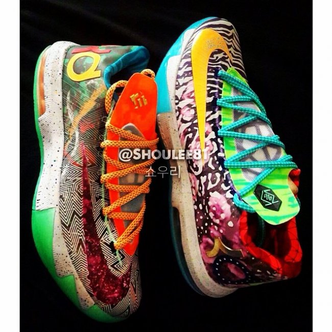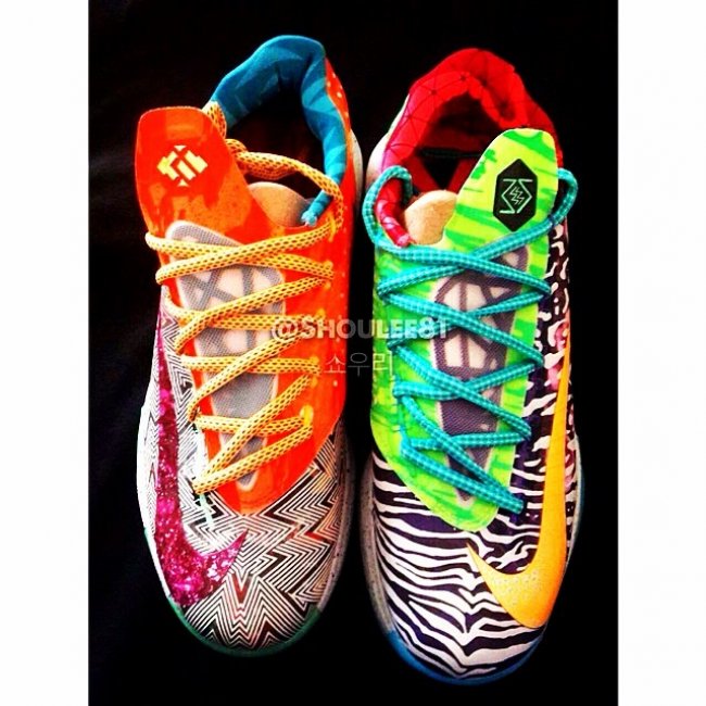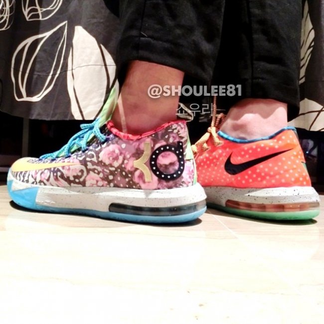 What The 系列从来不缺亮点,此次即将发售的这款 KD6 "What The KD" 延续了这一传统,融合了从之前所有 KD6 配色版本中的 35 个图案和颜色。从以马里兰蓝蟹为灵感的 Swoosh 到 Aunt Pearl 上的花状图案应有尽有,而 3M 反光效果的加持使其更具魅力。 货号:669809-500 发售日期:2014 年 6 月 7 日 发售价格:$150 相关信息: KD 6“ What The KD”鞋身细节详细解读 KD6 "What The KD" 高清实物图赏