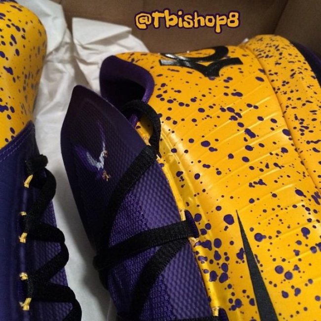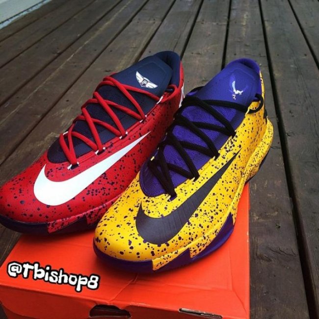 Nike KD 6已然成为不少校园球队的PE鞋款模板,比如眼前这两双。芬德兰高中版本为Henderson定做,蒙特沃德学院别注则为Montverde打造。鞋款分别以红色搭配海军蓝点缀白色、黄色搭配紫色辅以黑色,鞋舌均印有学校球队logo。