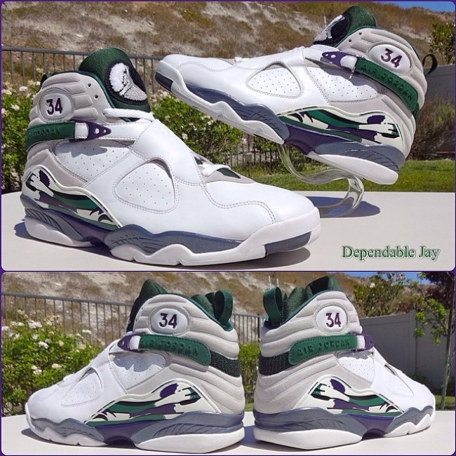 球鞋收藏家DependableJay再度为我们呈上自己的收藏,眼前这款Air Jordan 8 PE是为雄鹿队时期的Ray Allen特别订做,制作于2003年,尺码US14,鞋款以白色为主配以雄鹿队的深绿色以及紫色细节,鞋领附有背号34刺绣。