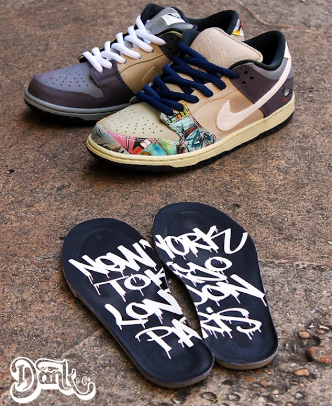 Nike SB城市系列被众多Sneaker奉为一时的经典之作,而近日 Dank Customs就以该系列为灵感打造了一款Nike SB Dunk Low “What the City Series” 定制鞋款。此鞋以混搭的概念,将四双Nike SB Dunk Low的精髓融入在鞋款设计之中。纽约的鸽子、伦敦的泰晤士河勾勒、巴黎的绘画及日本的简约让鞋款焕发出全新的生命。黑色的鞋垫上用泼墨字体写上了纽约、东京、伦敦及巴黎字样。