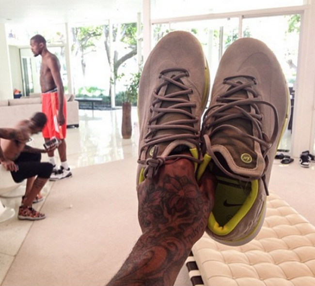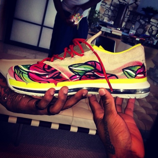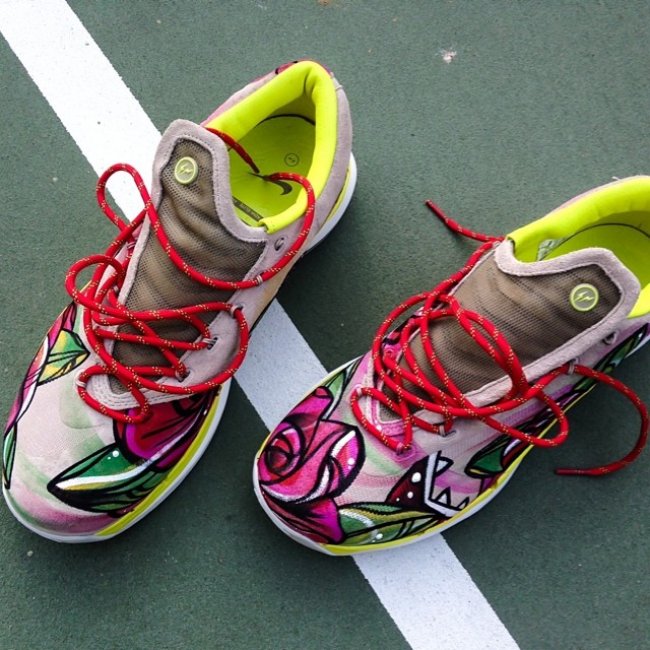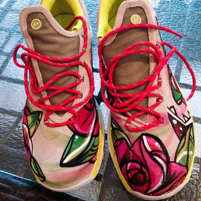 Fragment Design x Nike KD VI 曝光全新淡棕配色,大面积棕色麂皮呈现鞋身,搭配全掌Zoom Max中底。抢眼的荧光黄点缀在内衬、中底涂装等细节之上,将整体配色点亮。值得一提的是,知名街头艺术家Delano Brown还以这双Fragment Design x Nike KD VI 为蓝本,打造了一双充满个人风格的涂鸦版本。大面积的花卉图案配合上充满质感的麂皮鞋身,令Fragment Design x Nike KD VI 焕发出全新面貌。