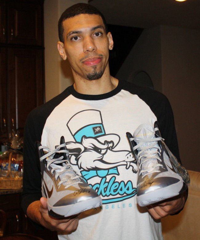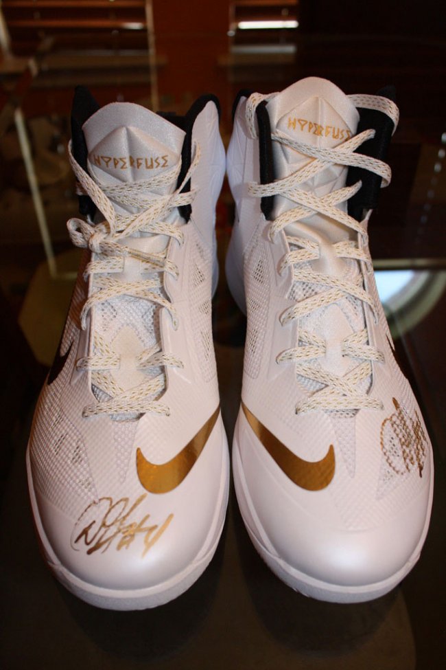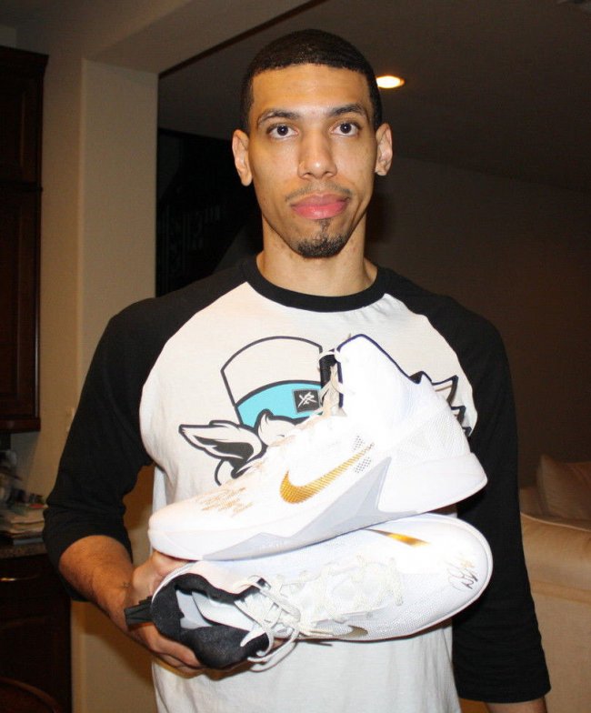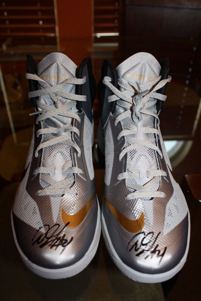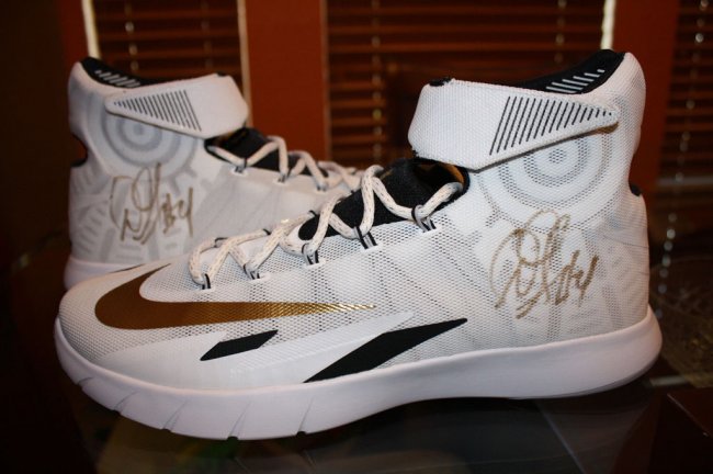 总决赛才刚上演两场,但你已经有机会得到为Danny Green专属打造的Nike总决赛PE鞋款。Danny Green换上Nike Air Zoom Flight The Glove,被替换且附上双签的Nike HyperRev以及Hyperfuse PE均被某卖家通过eBay拍卖出售,鞋款灰、白两色调均以金色呈现细节。