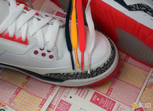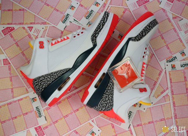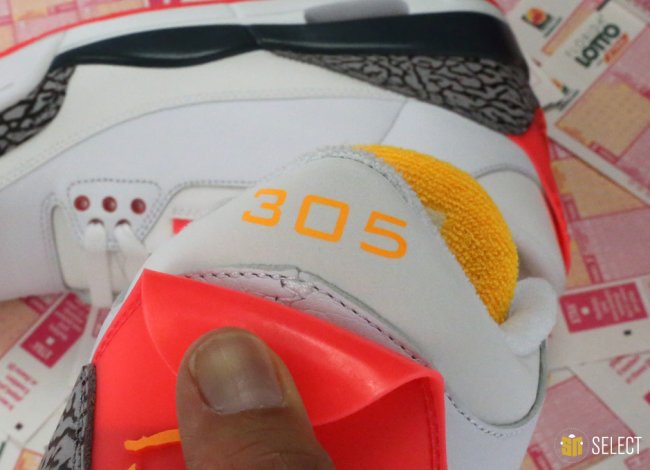 SoleFly 携手 Jordan Brand 打造的 SoleFly x Air Jordan 3 “Lotto” 联名鞋款,以经典的白色鞋面、黑白中底以及黑灰爆裂纹呈现。细节则采用了红色和黄色打造,再现经典的同时又加入了新的元素。 作为以乐透彩票为题材的联名鞋款,在后跟、鞋垫、鞋带等细节方面也颇为用心,值得细细品味。
