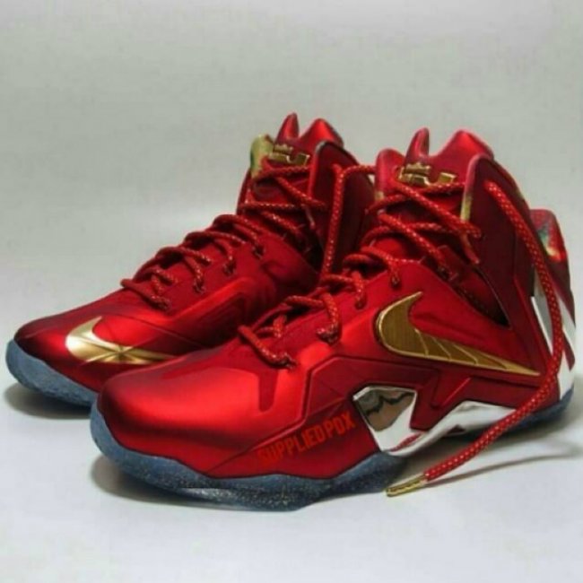 昨天我们曝光了一款红金配色的 LeBron 11 Elite,疑似专为热火三连冠所打造的总冠军配色,现在又曝光另外一款总冠军配色的 LeBron 11 Low。 两双球鞋都延续了 LBJ 系列的总冠军套装配色风格,LeBron 11 Elite 采用红色鞋身点缀金色细节,另外一双 LeBron 11 Low 则采用多彩图纹装扮。热火痛失本次冠军头衔,此套装也将停留在 Sample 样品阶段。