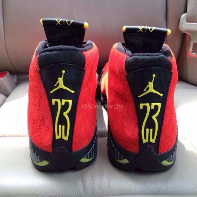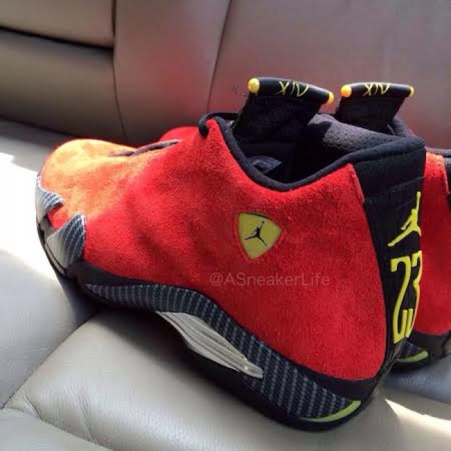红色麂皮鞋面点缀黄色细节,Air Jordan 14 “Ferrari” 运用热烈而颇具活力的配色再现了法拉利跑车的魅力。辅以碳纤维图纹和黑色细节,进一步提升了整体的质感。 货号为 654459-670,或将在 2014 年秋季正式发售。