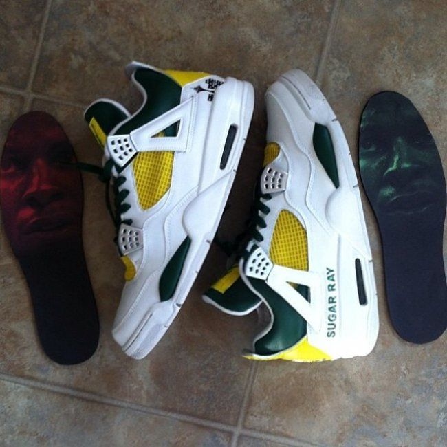 眼前这双西雅图超音速配色的Air Jordan 4 PE是Jordan Brand为当时身为超音速球员的Ray Allen特别打造的。白色鞋身搭配黄色与绿色的点缀,左脚后跟处印有西雅图当地标志性的太空针塔剪影,令鞋款极具超音速格调。而鞋垫上印制的Ray Allen头像与后跟Sugar Ray字样,则告诉了我们此鞋的主人是谁。