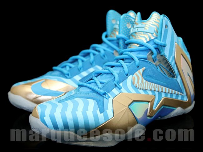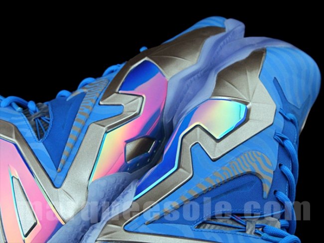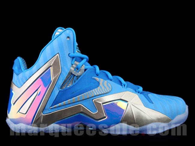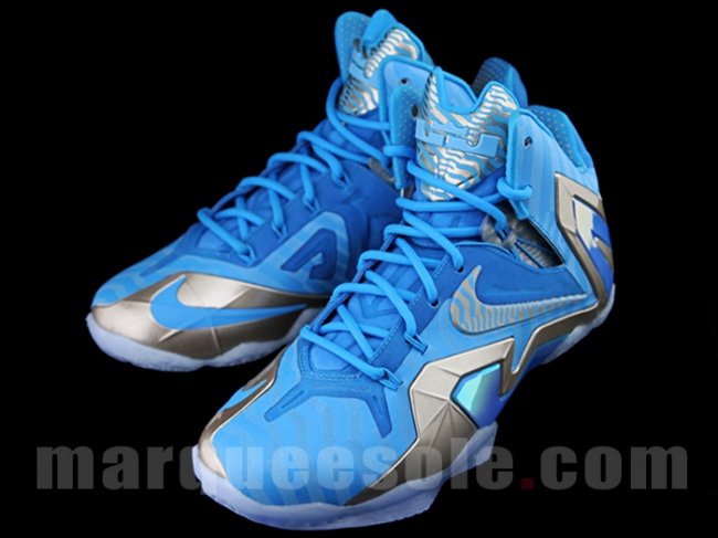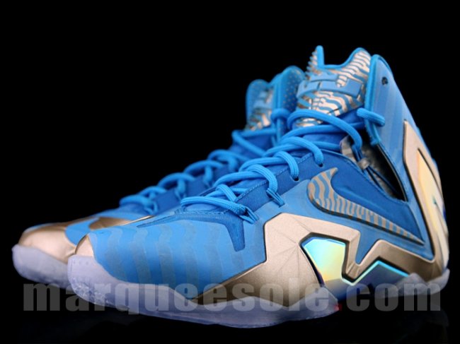 带来 LeBron 11 Elite 新款配色,此次采用蓝色作为主色调打造鞋身,并搭配水晶大底。鞋身上辅以带有彩虹反光效果的银色 TPU 装饰及大面积银色虎纹 3M 反光细节,令鞋款整体清新而富有细节。