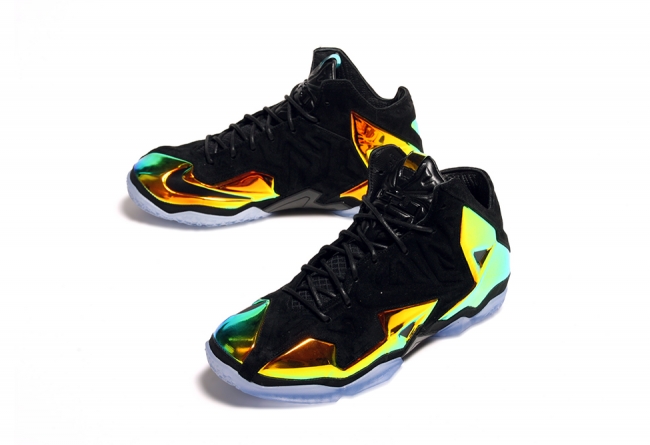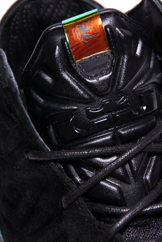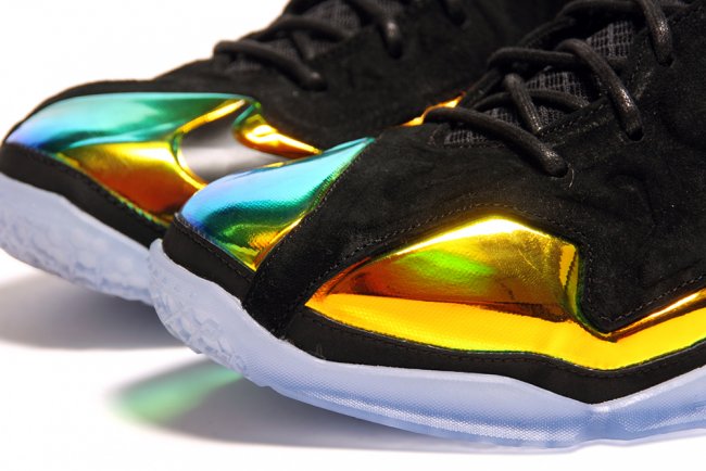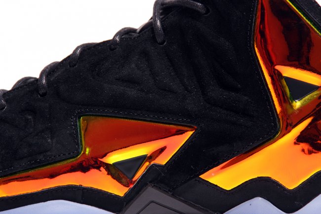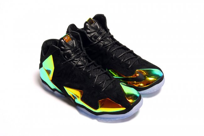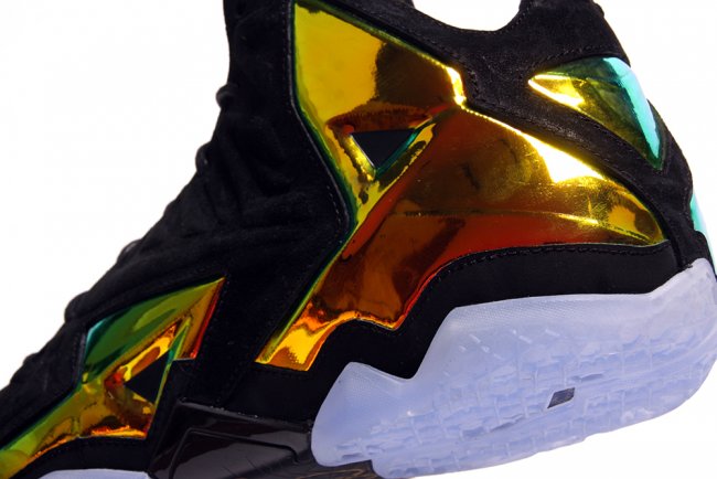 这款 LeBron 11 EXT “Kings Crown” 采用麂皮结合金黄色金属质感的 Hyperposite 材质打造鞋身,King James 的荣耀和王者霸气一览无余。 蓝色水晶大底则犹如王者皇冠上的蓝宝石,在黑色鞋面和金属材质的陪衬下闪闪发亮。部分海外区域将于 7 月 4 日正式发售。 货号:677693-001 发售价:¥1999