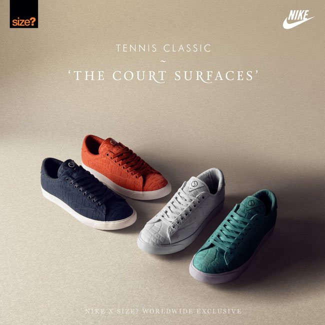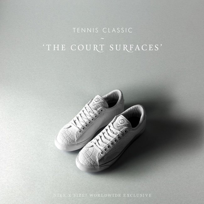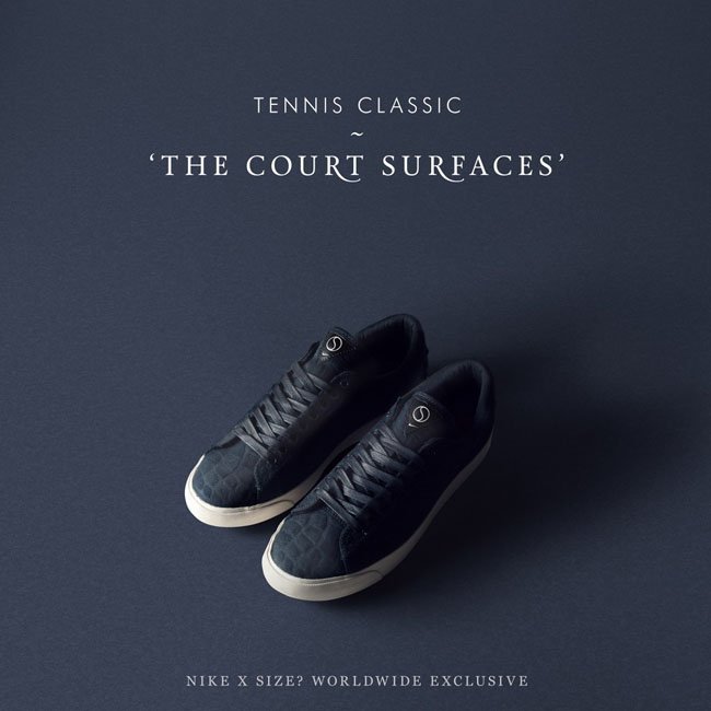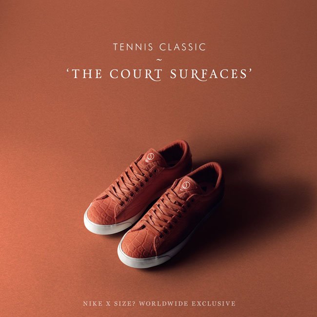 以不同于篮球运动硬木地板的网球场地为灵感,size?联手Nike呈上全新联名Tennis Classic AC “Court Surfaces”系列鞋款。鞋款鞋身以鳄鱼纹理装饰,穿上防水鞋带,玉石绿、复古橙、纯白以及暗海军蓝四款配色均搭配白色鞋底。此系列将于7月4日正式发售。