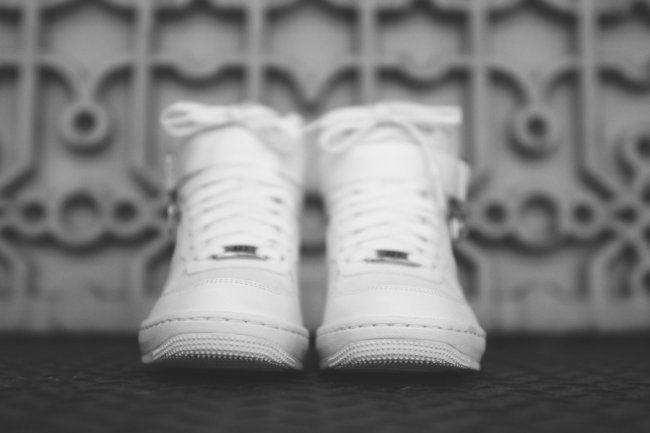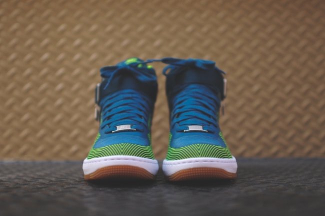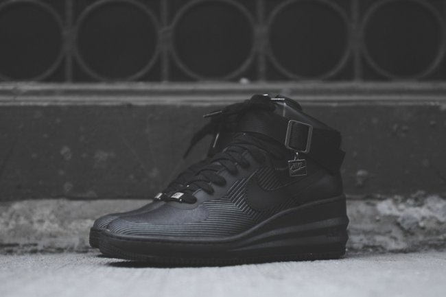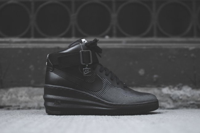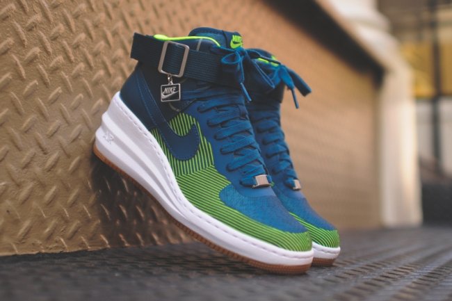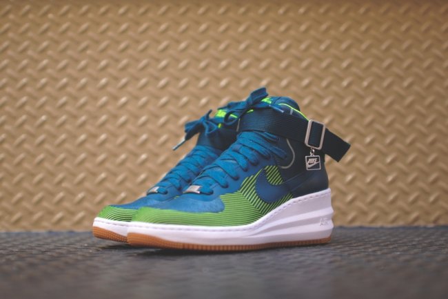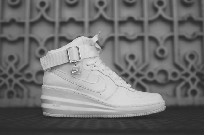 Nike坡跟鞋款多添一双Lunar Force 1 Sky Hi,鞋身保留Air Force 1的经典线条,中底改为Lunarlon坡跟设计,兼顾时尚感以及舒适感。白色皮革版本货号654848-100,黑色织物鞋面版本货号654849-001,蓝/荧光绿色货号654849-400,三款现均已发售。